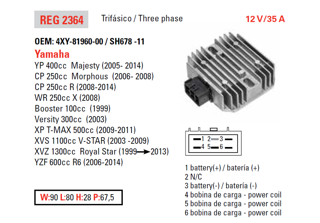 Díl DZE regulátor napětí CAN AM; HONDA TRX 500FA/FGA 01-04; KAWASAKI KVF 650/750 BRUTE FORCE 05-13; SUZUKI LT-A 400/500/700/750 02-18 KINGQUAD ; YAMAHA YFM 450/660700 02-14; YFZ 450R 09-21 (OEM-4XY-81960-00) (ESR135) je vhodný pro: