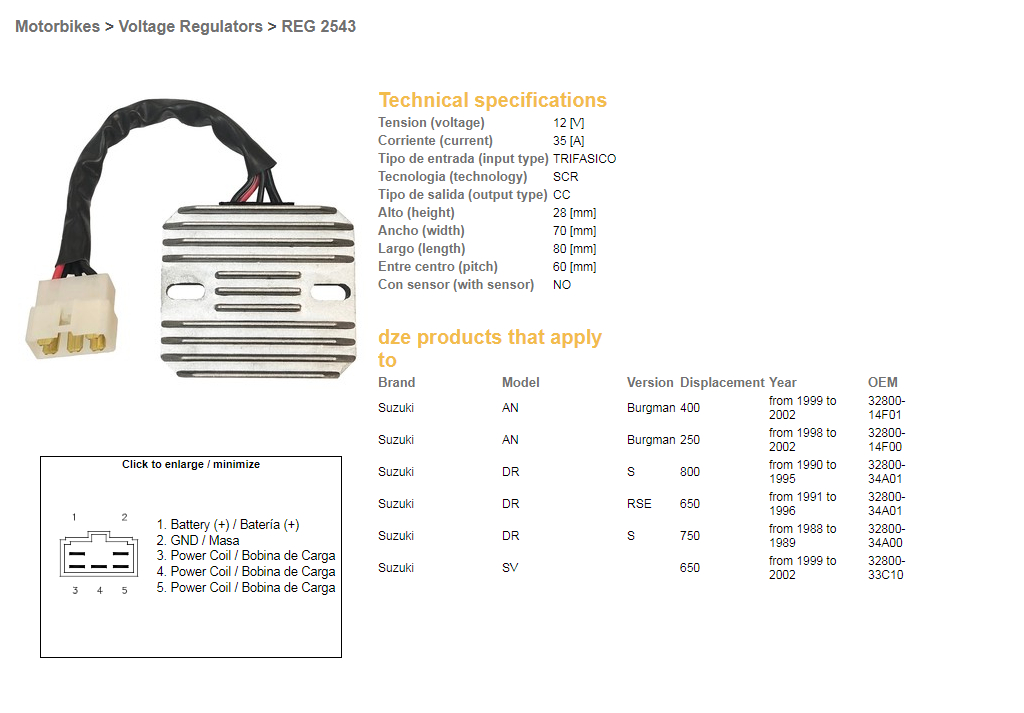 - DZE regulátor napětí SUZUKI AN 250 BURGMAN 98-02; AN 400 BURGMAN 99-02; SV 650 99-02; DR 650RSE 91-96; DR 750S 88-89; DR 800S 90-95 (32800-34A00, 32800-14F00) 12V35A